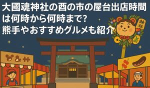 中でも気になるのは、「屋台って何時から?」「どんなグルメがあるの?」「熊手はどこで買えるの?」というポイントですよね。